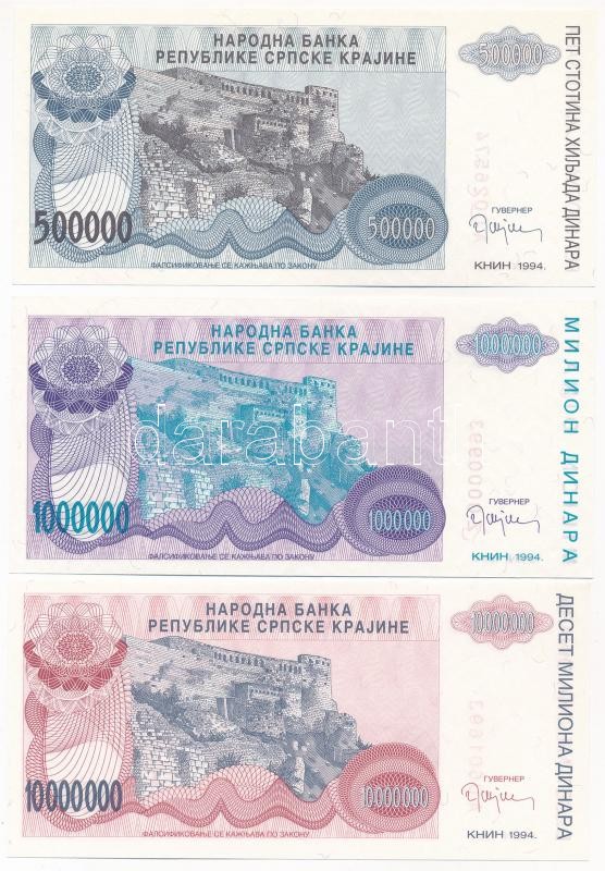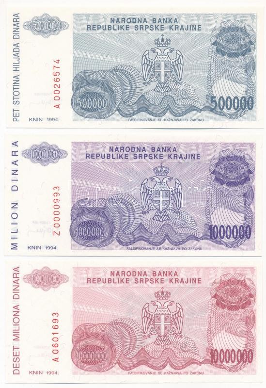 Croatia / Republic of Serbian Krajina / Knin 1994. 500.000 Dinara + 1.000.000 Dinara replacement note with low "Z 0000993" serial number + 10.000.000 Dinara C:UNC