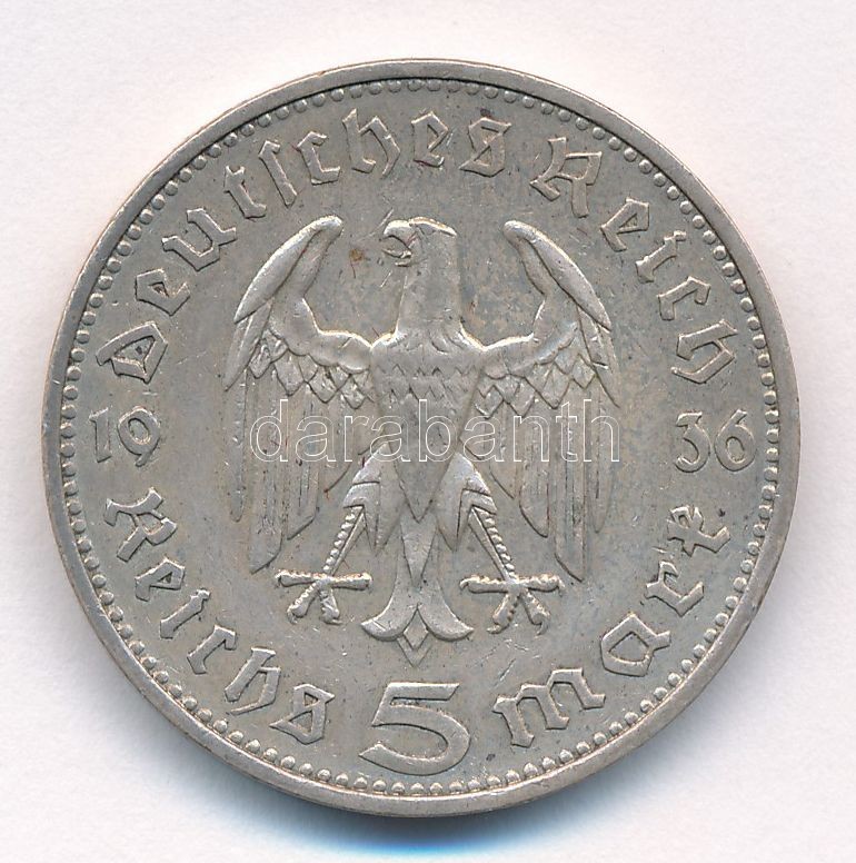 https://www.darabanth.com/en/420-Online-auction/420.0/Numismatics/Worldwide-silver-and-metal-coins~2000016/Nemet-Harmadik-Birodalom-1936F-5M-Ag-Hindenburg-T2-German-Third-Reich-1936F-5-Mark-Ag-Hindenbur~II2665865