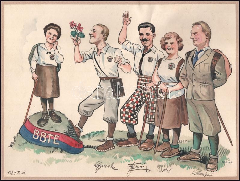 1931 Gönczi-Gebhardt Tibor (1902-1994): BBTE (Budapesti Budai Torna Egylet) turista szakosztályának tagjait ábrázoló grafika, rajta 4 tag aláírásával, akvarell-tus, jelzett, kartonra kasírozva, a karton sérült, javított, 20,5x27,5, teljes: 29x35 cm