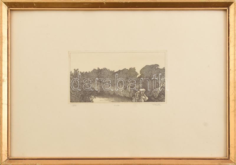 Tulipán László (1943-2007): Séta. Rézkarc, papír, jelzett, számozott: 31/100. Üvegezett fakeretben, 10×18 cm