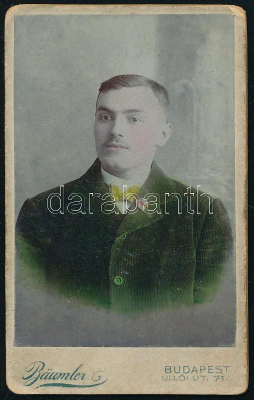 1907 Szabadszállásy László vizitkártyája, keményhátú fotó Bäumler budapesti műterméből, utólagos színezéssel, 11x7 cm