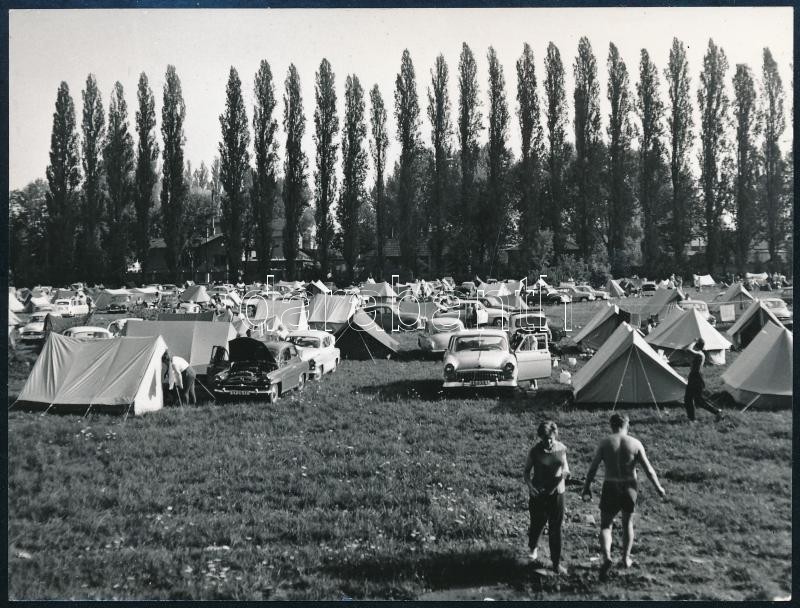 1964 Kemping a Római-parton, főleg szocialista turistákkal, Kácsor László fotója, hátoldalon pecséttel, 9×11,5 cm