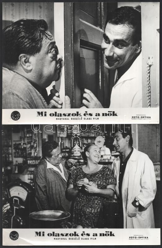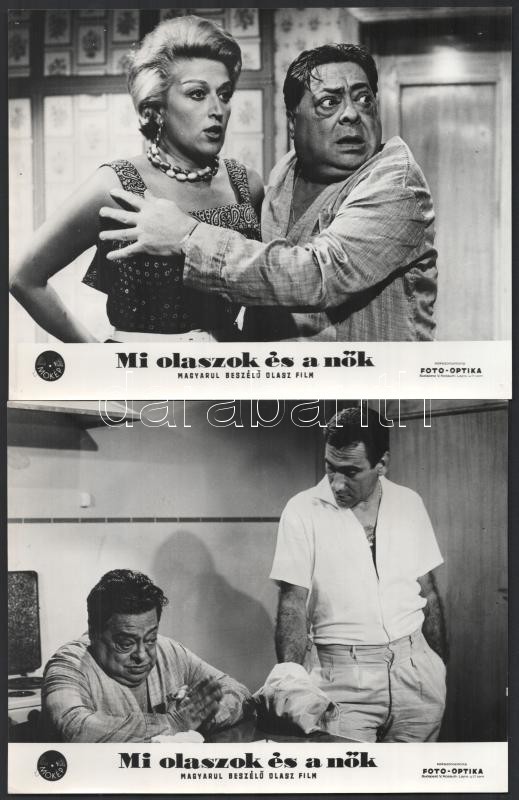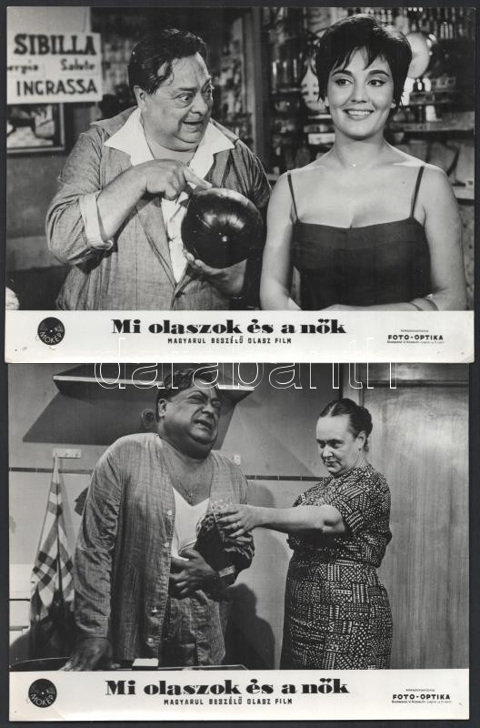 cca 1965 ,,Mi olaszok és a nők" című olasz film jelenetei és szereplői, 6 db vintage produkciós filmfotó, ezüst zselatinos fotópapíron, a sarkoknál tűzés nyoma, 18x24 cm