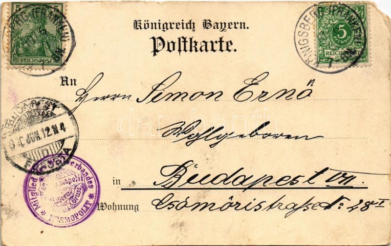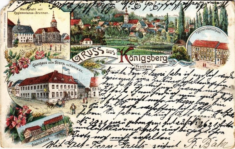 1900 Königsberg in Bayern, Marktplatz mit Regiomontanus-Brunnen, Regiomontanushaus, Gasthaus zum Stern, Friedrichsbad / square, fountain, inn, hotel, spa, bath. Schneider & Co. Art Nouveau, floral, litho (EM)