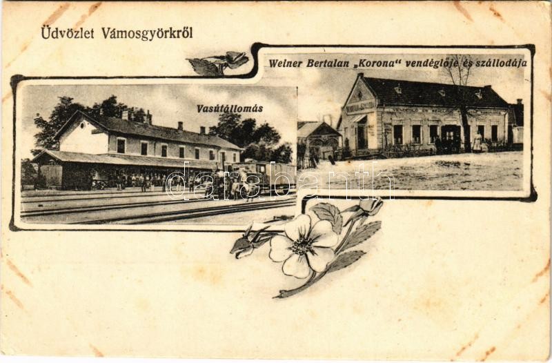 Vámosgyörk, vasútállomás, gőzmozdony, vonat, Weiner Bertalan Korona nagyvendéglője és szállodája és saját kiadása. Art Nouveau, floral (EK)