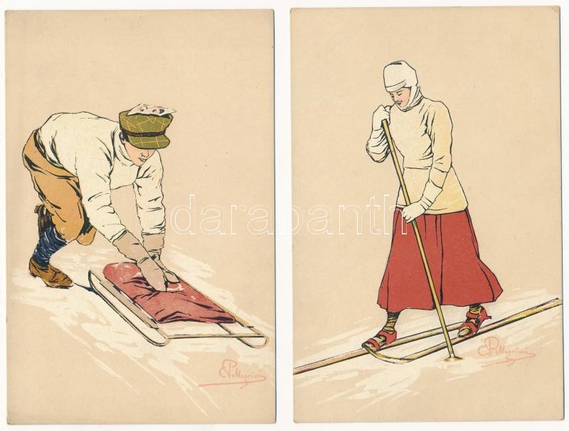 Description: 2 db RÉGI litho művész képeslap téli sportokról, P. Megrini szignóval: síelés és szánkózás / 2 pre-1945 litho art postcards of winter sport, signed by P. Megrini: sledding and skiing