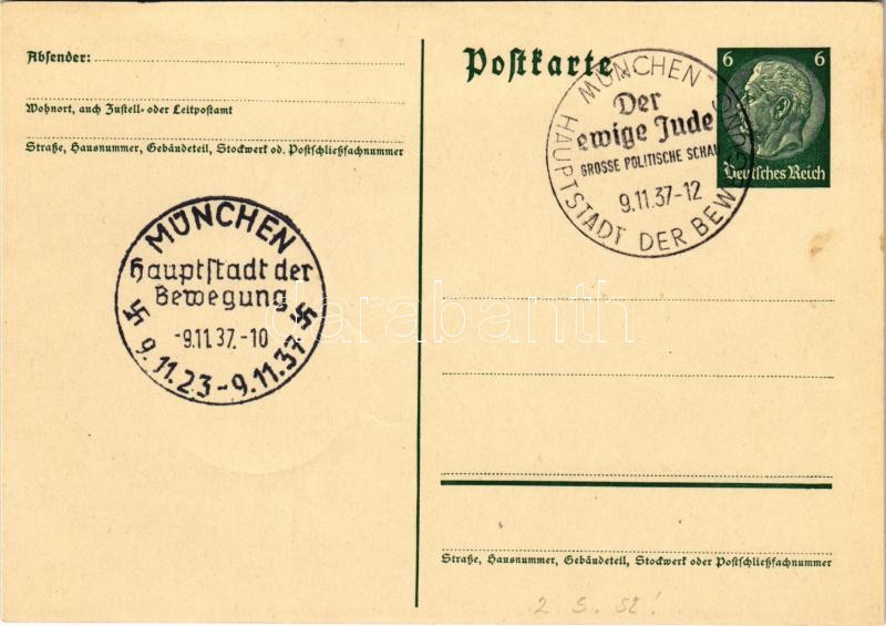 1937 München, Hauptstadt der Bewegung "Der ewige Jude" grosse politische Schau / NSDAP German Nazi Party propaganda + So. Stpl. (fl)