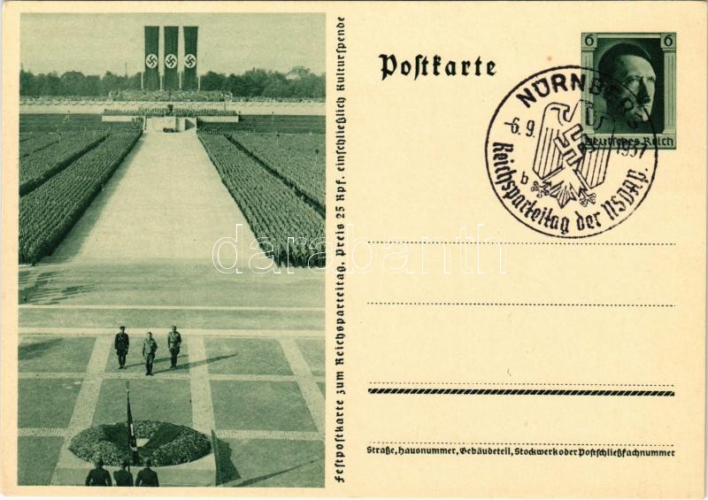 Description: Festpostkarte zum Reichsparteitag / Nuremberg Rally, NSDAP German Nazi Party propaganda, swastika flags; 6 Ga. Adolf Hitler + "NÜRNBERG Reichsparteitag der NSDAP 6. 9. 1937" So. Stpl. (EK)