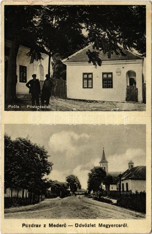 1943 Megyercs, Mederc, Calovec; Posta, utca, templom / post office, street, church (EB)
