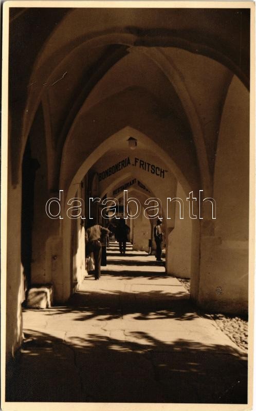 Beszterce, Bistritz, Bistrita; árkádok, Bonboneria Fritsch üzlete, Rus...