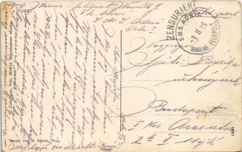 Description: 1915 Pola, Pula; SMS Bellona az Osztrák-Magyar Haditengerészet uszály laktanyája a matrózoknak a kikötőben (ex SMS Kaiser) / K.u.K. Kriegsmarine Wohnschiff / WWI Austro-Hungarian Navy Barracks ship for mariners, naval base. G. Costalunga, Pola 1914/15. Druck v. M. Schulz + "ZENSURIERT SMS ADRIA MARINE-FELDPOST" (EK)