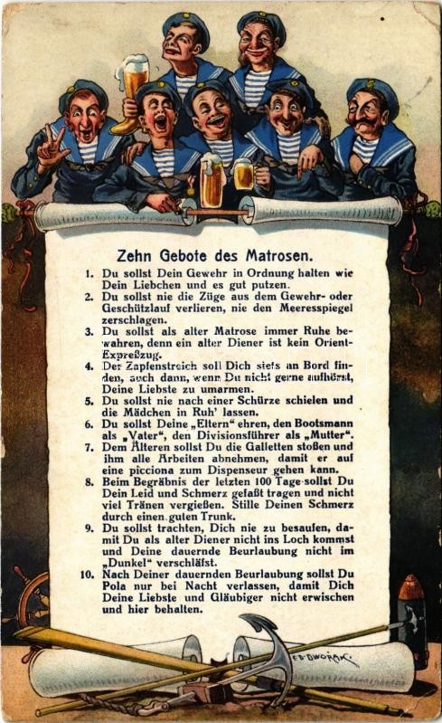 1915 Zehn Gebote des Matrosen / Ten commandments of the mariners. K.u.... https://www.darabanth.com/en/420-Online-auction/420.0/Postcards/Warships~1000026/1915-Zehn-Gebote-des-Matrosen-Ten-commandments-of-the-mariners-KuK-Kriegsmarine-mariners-humo~II2662835