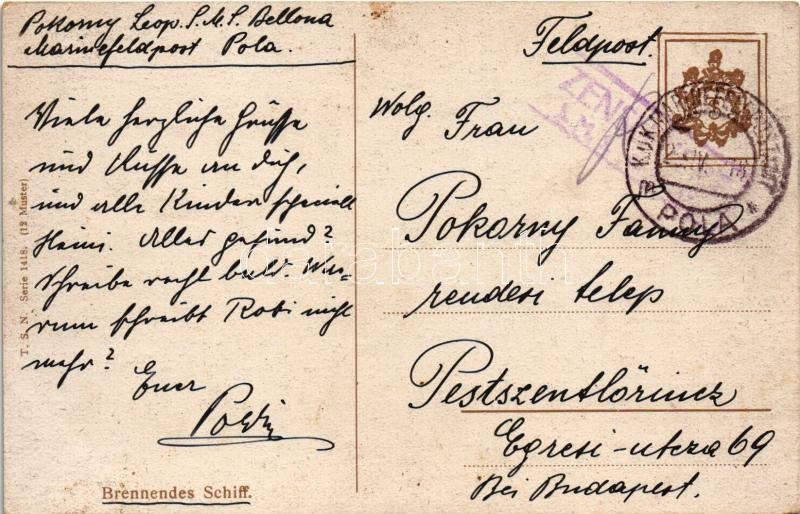 1918 Brennendes Schiff / WWI German Navy (Kaiserliche Marine) art postcard, burning ship. T.S.N. Serie 1418. + "ZENSURIERT SMS BELLONA" (EK)