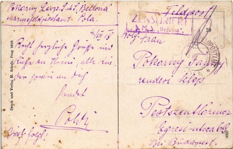 1918 SMS Monarch osztrák-magyar Monarch-osztályú partvédő páncélosa / K.u.K. Kriegsmarine / WWI Austro-Hungarian Navy SMS Monarch, Monarch-class coastal defense ship. Druck und Verlag M. Schulz + "ZENSURIERT SMS BELLONA" (EB)