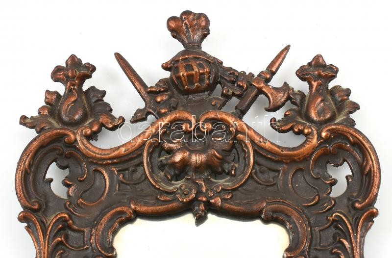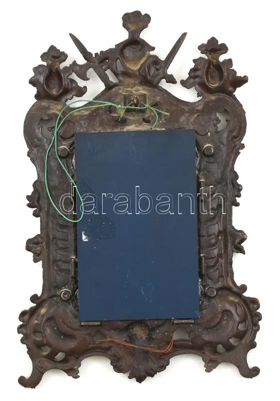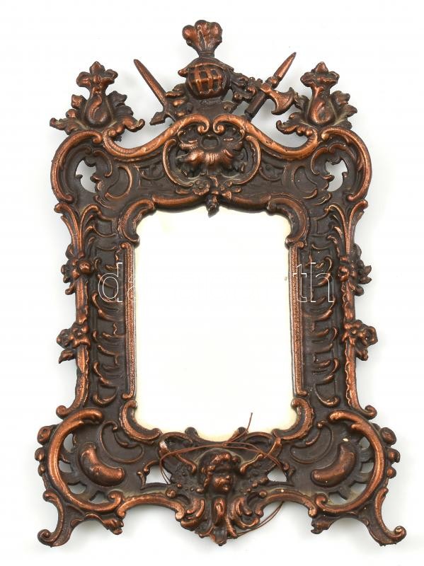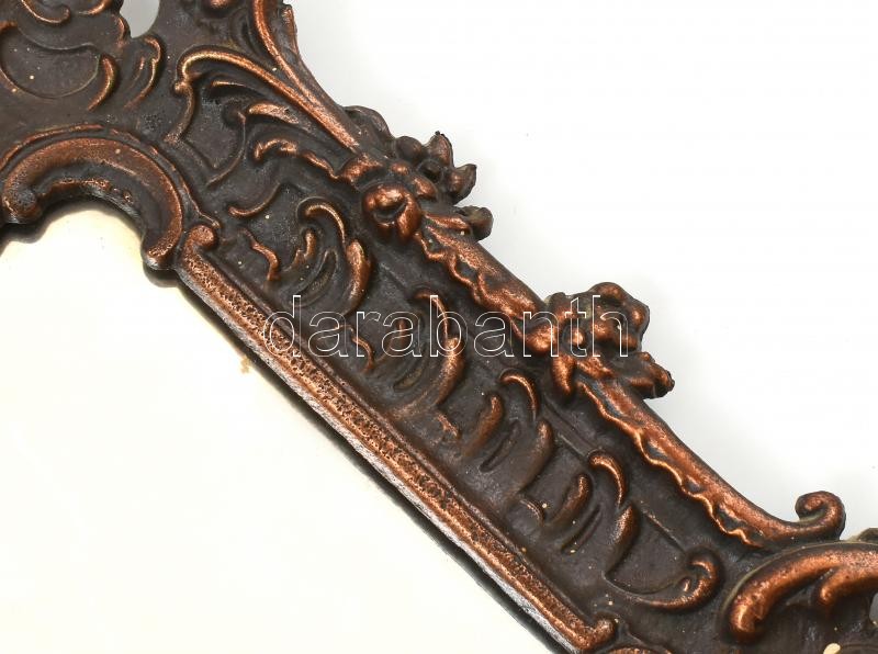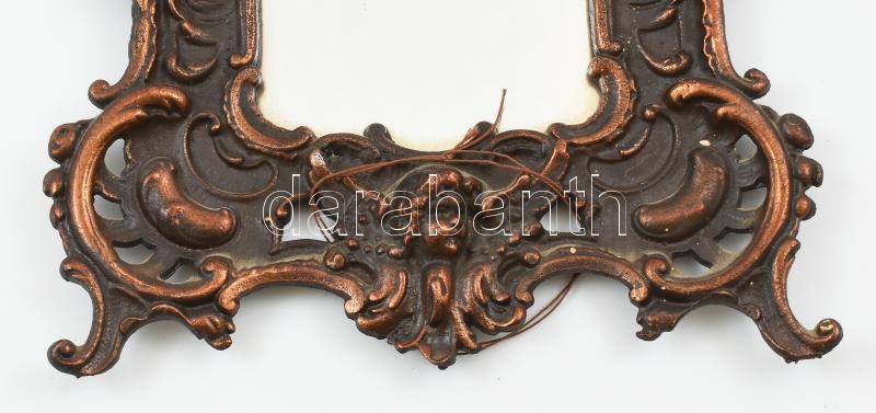 Régi fém, tükör / képkeretnek is használható, falra akasztható, szép állapotban, neorokkokós, puttós és lovag motívummal, 14x10 / 33x22 cm