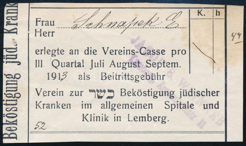 1913 Lemberg, zsidó kórház díj nyugta / Lemberg Jewish hospital receip...