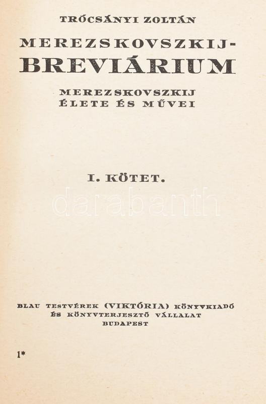 Trócsányi Zoltán: Mereszkovszkij-Breviárium. Merezskovszkij élete és m... https://www.darabanth.com/en/421-Online-auction/421.0/Books/Books-History~1000008/Trocsanyi-Zoltan-Mereszkovszkij-Breviarium-Merezskovszkij-elete-es-muvei-I-kotet-Bp-B~II2671146
