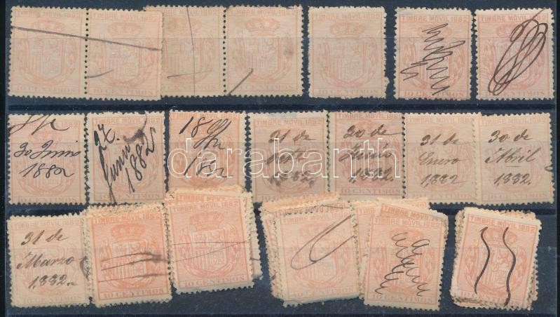 Spanyolország 1882 ~65 db okmánybélyeg 1 db stecklapon érdekes kézi érvénytelenítésekkel