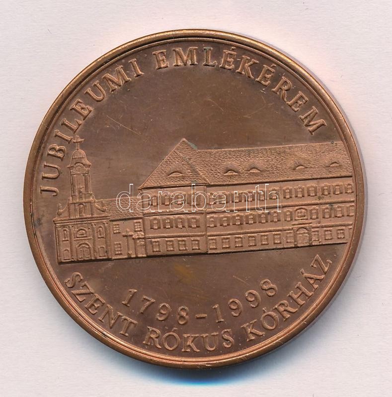 Kiss György (1943-) 1998. "Szent Rókus Kórház - 200 éve a gyógyításban... https://www.darabanth.com/en/421-Online-auction/421.0/Numismatics/Hungarian-Physician-Commemorative-Medallions-and-Plaques~3000019/Kiss-Gyorgy-1943-1998-Szent-Rokus-Korhaz-200-eve-a-gyogyitasban-1798-1998-Jubileumi~II2676712