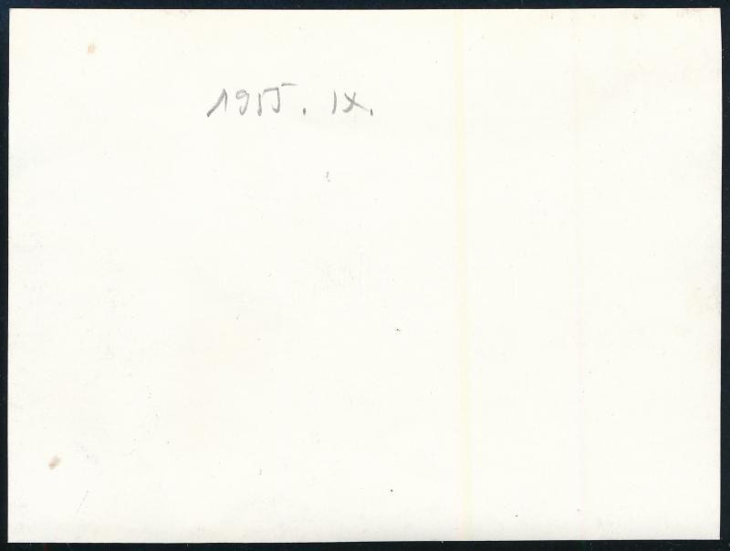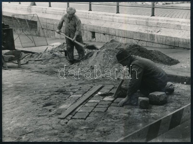1955 Budapest, utcakövek lerakása útépítésen (valószínűleg rakparti rész), hátoldalon dátumozott fotó, szép állapotban, 8,5×11,5 cm