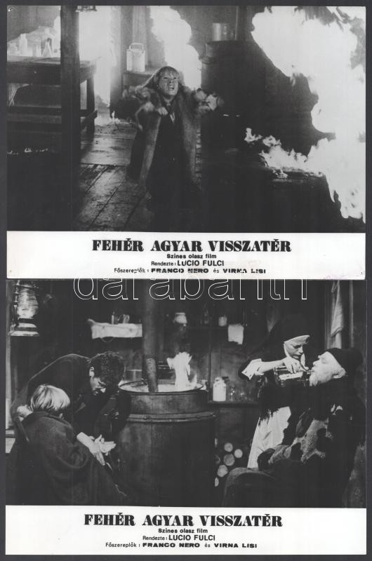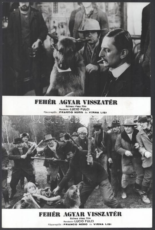 Description: 1974 ,,Fehér Agyar visszatér" című olasz film jelenetei és szereplői (köztük Franco Nero, Virna Lisi), 13 db vintage produkciós filmfotó, ezüst zselatinos fotópapíron,a használatból eredő kisebb hibákkal, 18x24 cm