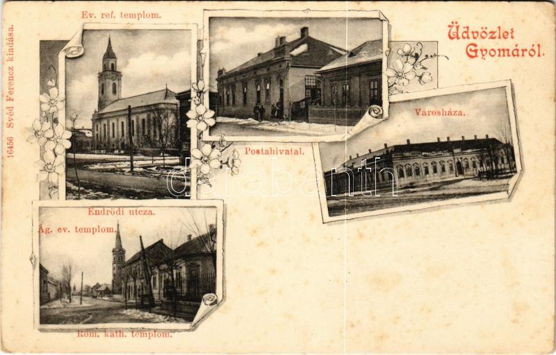 Description: Gyoma (Gyomaendrőd), Postahivatal, református, római katolikus és ágostai evangélikus templom, Endrődi utca, városház, tél. Svéd Ferenc kiadása, Art Nouveau, floral (fl)