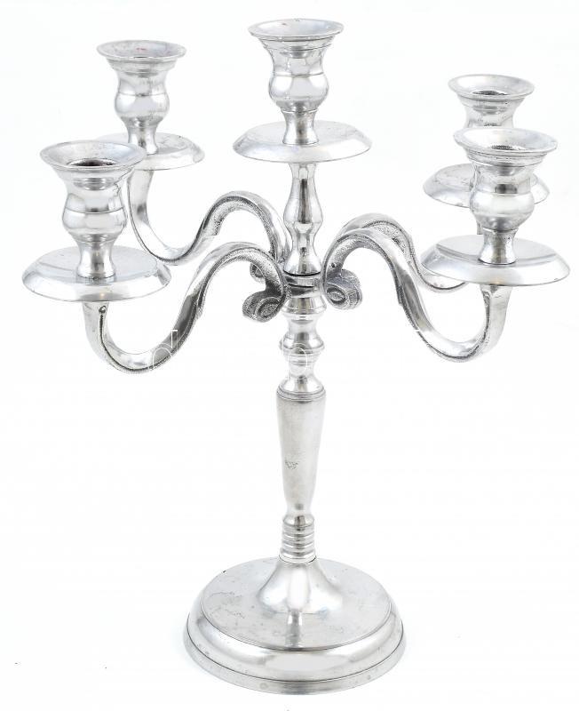 Ezüst színű ötágú gyertyatartó, kopásnyomokkal, m: 33 cm