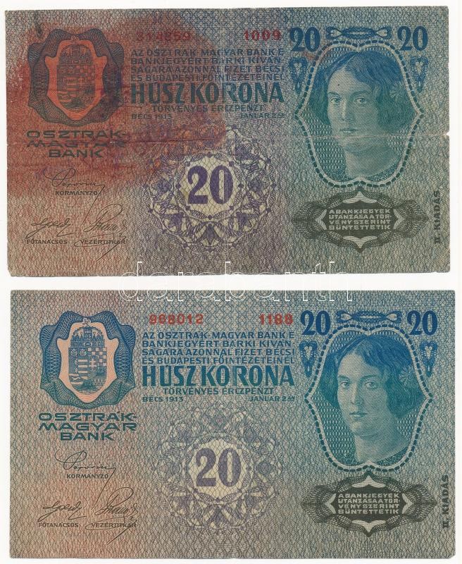 1913. 20K II. kiadás (2x), egyik piros "Deutschösterreich" felülbélyegzéssel, másik cirill betűs felülbélyegzéssel T:III,III- egyiken nagy piros folt