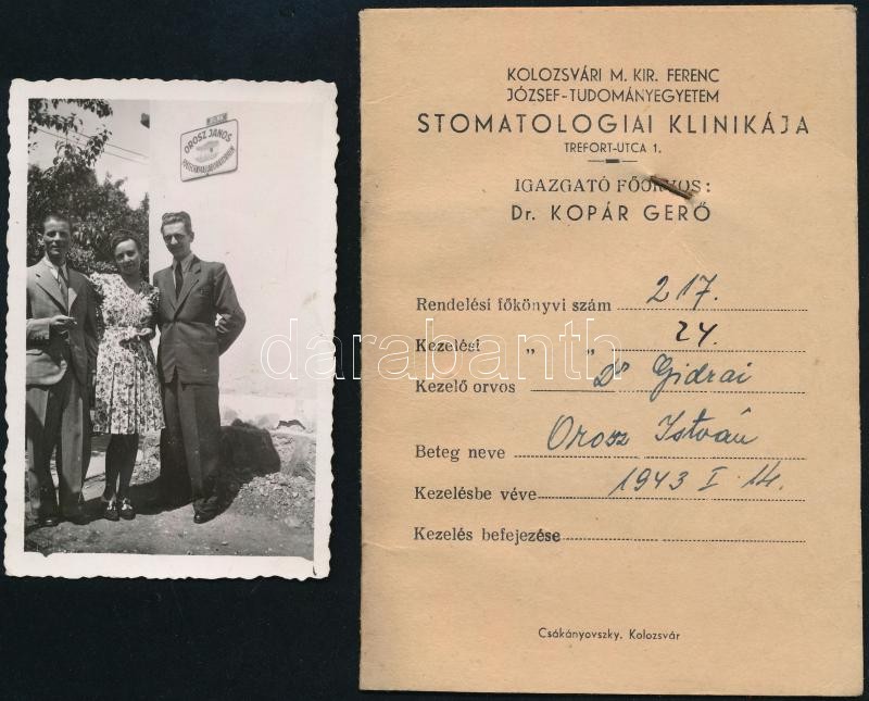 Description: 1943 A Kolozsvári M. Kir. Ferenc József Tudományegyetem stomatológiai klinikája kezelési igazolványa, belül hozzátűzött papírtasakkal + Orosz János fogtechnikai laboratórium táblája előtt álló fiatalok, hátoldalán feliratozott fotó, 9x6 cm