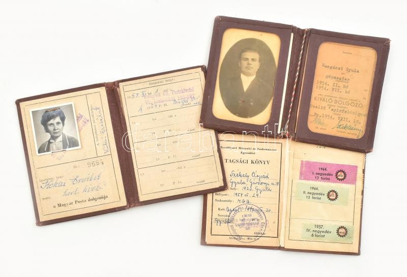 Description: 1954-1964 3 db igazolvány: Sztahanovista kiváló dolgozó jelvény viselésére jogosító fényképes igazolvány, tokban + Magyar Posta fényképes dolgozói igazolvány + Textilipari és Műszaki Tudományos Egyesület tagsági könyv, bélyegekkel