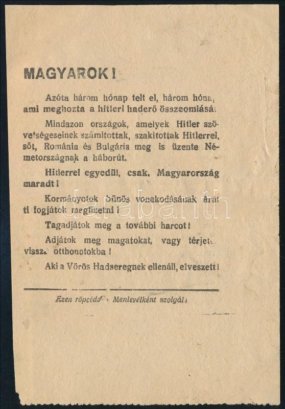 1944 Magyarok! Szovjet világháborús röpcédula, mely menlevélként is sz... https://www.darabanth.com/en/423-Online-auction/423.0/Art-and-other-collectibles/Military~52/1944-Magyarok-Szovjet-vilaghaborus-ropcedula-mely-menlevelkent-is-szolgalt-es-a-magyar-ka~II2693538