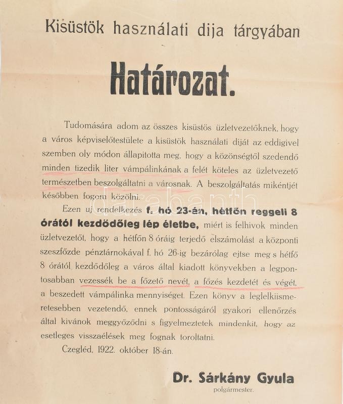 1922 Cegléd pálinkafőző kisüstök használatra és a fizetendő vámpálinkára vonatkozó hirdetmény.- 31x36 cm