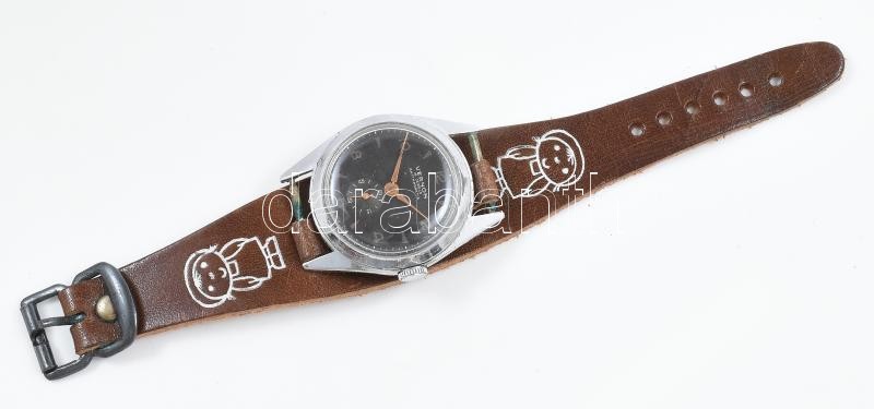 Vernon mechanikus karóra, működik, kopásokkal, apró karcokkal, gyerek bőr szíj, d: 35 mm