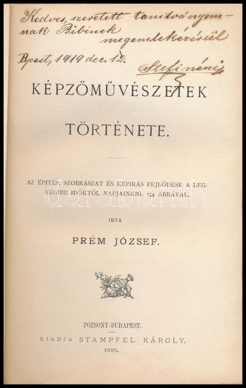 Prém József: Képzőművészetek története. Az építés, szobrászat és képírás fejlődése a legrégibb időktől napjainkig, 154 ábrával. Pozsony-Bp., 1896., Stampfel Károly, (Pozsony, Eder István-ny.), XIV+2+192 p. Kiadói kissé kopott egészvászon-kötés, ajándékozási sorokkal.