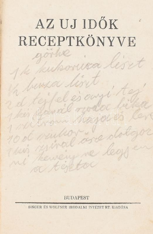 Az Uj Idők receptkönyve. + Az Uj Idők második receptkönyve. Bp.,1931-1... https://www.darabanth.com/en/423-Online-auction/423.0/Books/Books-Gastronomy-and-Gardening~2000012/Az-Uj-Idok-receptkonyve-plus-Az-Uj-Idok-masodik-receptkonyve-Bp-1931-1934-Singer-es-Wolfner-K~II2690162