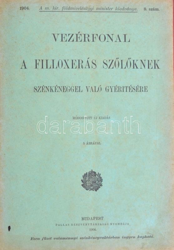 Description: Vezérfonal a filloxerás szőlőknek szénkéneggel való gyérítésére. A m. kir. földmívelésügyi minister kiadványa. 8. szám. Bp., 1904, Pallas-ny., (2)+190 p. + VIII t. Szövegközi fekete-fehér ábrákkal és színes képtáblákkal illusztrálva. Egészvászon-kötésben, kissé koszos borítóval, helyenként kissé foltos lapokkal, az eredeti papírborító bekötve.