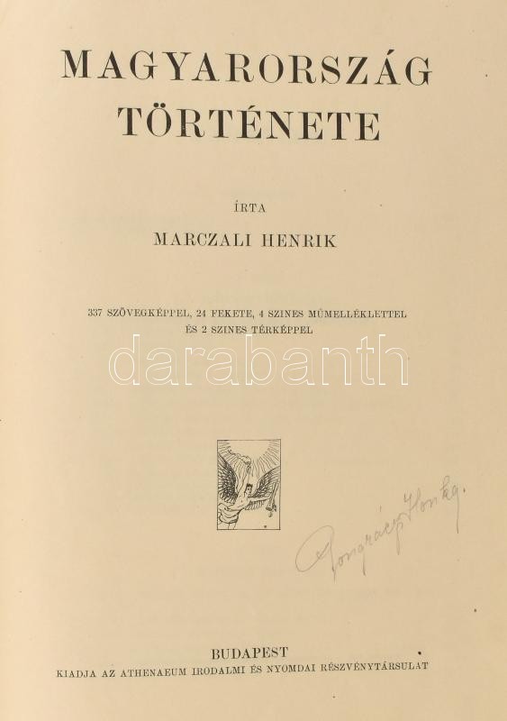 Marczali Henrik: Magyarország története. A Műveltség Könyvtára. Bp., 1911, Athenaeum, (8)+724 p. Számos szövegközi fekete-fehér illusztrációval. Oldalszámozáson kívül térképekkel, képtáblákkal, mellékletekkel. Kiadói szecessziós, aranyozott, dombornyomásos félbőr-kötés, fém plakettel, a gerincen kisebb sérülések, kopásnyomok.