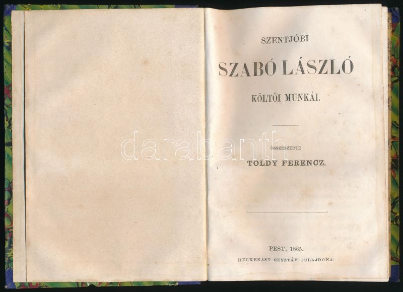 Szentjóbi Szabó László költői munkái. Összeszedte Toldy Ferenc. Pest, ... https://www.darabanth.com/en/423-Online-auction/423.0/Books/Books-Other-rarities~2000023/Szentjobi-Szabo-Laszlo-koltoi-munkai-Osszeszedte-Toldy-Ferenc-Pest-1865-Heckenast-GusztC3~II2689198