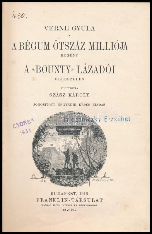 Verne Gyula: A bégum ötszáz milliója. A "Bounty" lázadói. Ford.: Szász Károly. Bp., 1916, Franklin-Társulat, 230 p. Egészoldalas fekete-fehér illusztrációkkal. Kiadói illusztrált, festett, aranyozott egészvászon-kötés, kissé sérült, kopott borÃtóval, helyenként kissé foltos lapokkal.