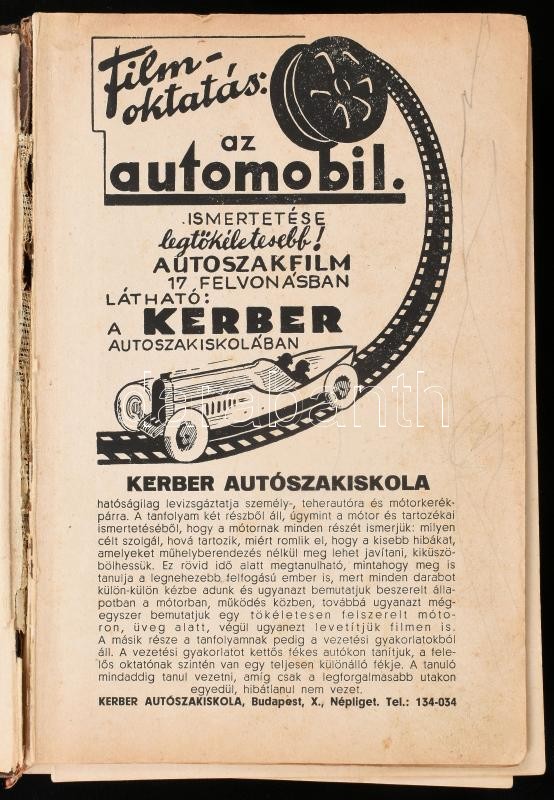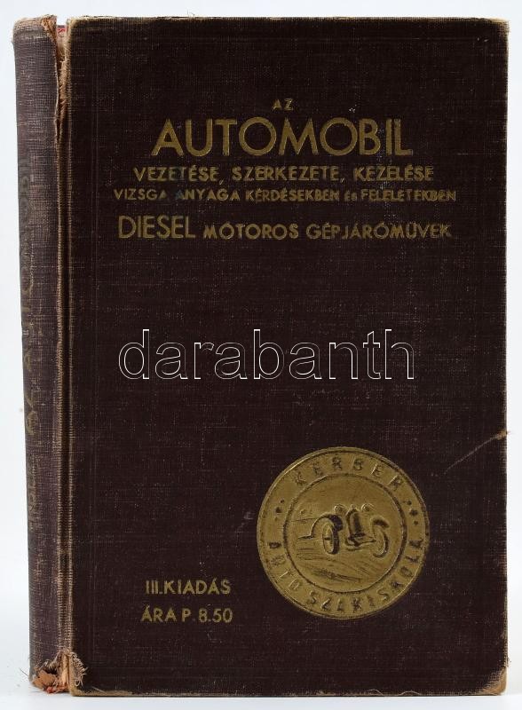 Kerber Áron: Az automobil vezetése, szerkezete és kezelése. A teljes vizsgaanyaggal, kérdésekben és feleletekben. Hibák keresése és javítása. Az autó ápolása és karbantartása. Dieselmotoros gépjárművek. Bp., [1940], Merkantil, 478+(1) p. + 1 (színes) t. Harmadik kiadás. Számos fekete-fehér ábrával illusztrálva. Kiadói aranyozott, dombornyomott egészvászon-kötés, sérült, a könyv elején a lapok a 48. oldalig kijárnak.