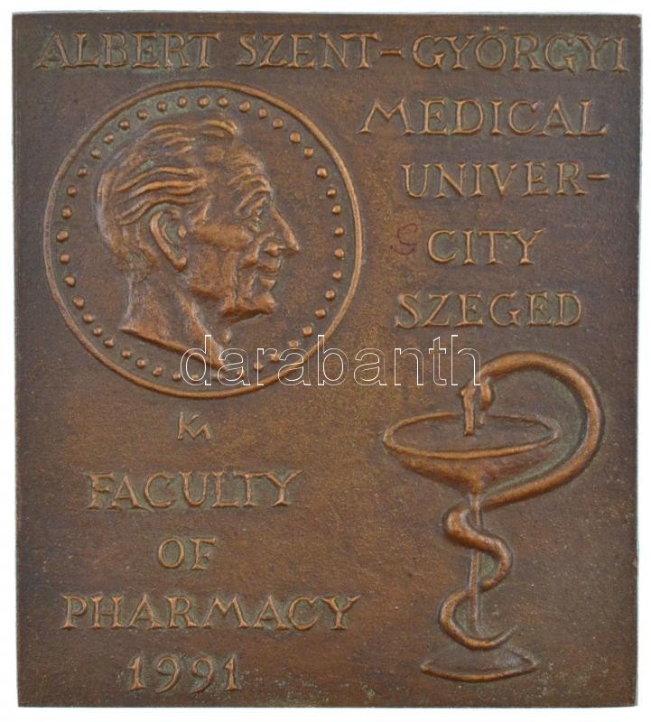 Kalmár Márton (1946- ) 1991. "Albert Szent-Györgyi Medical Univercity(sic!) Szeged - Faculty of Pharmacy 1991" egyoldalas, öntött bronz plakett (101x91mm) T:1-