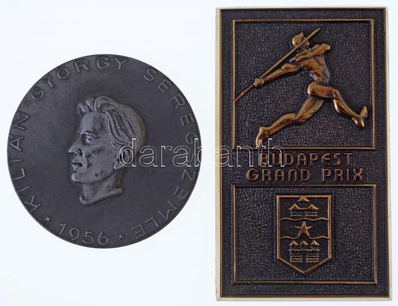 Description: 1956. "Kilián György seregszemle / A seregszemle budapesti döntőjén elért eredményért" fém emlékérem (50mm) + ~1970-1980. "Budapest Grand Prix" Br plakett, eredeti tokban (45x76mm) T:2