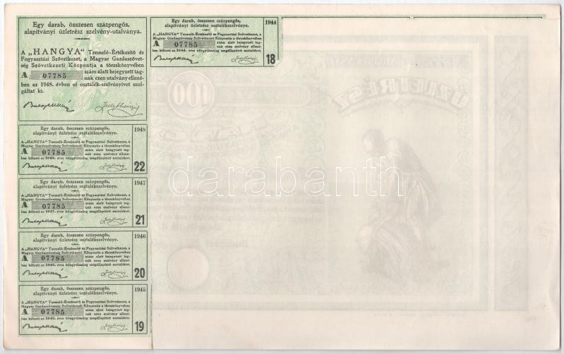 Budapest 1940. "Hangya Termelő-Értékesítő és Fogyasztási Szövetkezet" névre szóló alapítványi részvénye 100P-ről, szárazpecséttel, szelvényekkel T:I-