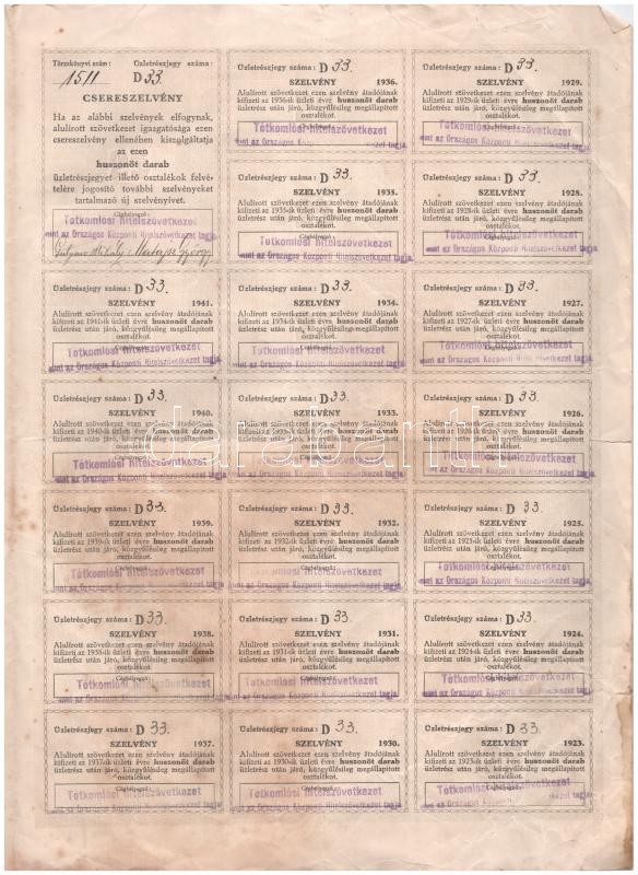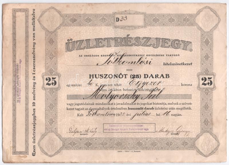 Tótkomlós 1923. "Tótkomlósi hitelszövetkezet" névre szóló üzletrészjegye, huszonöt üzletrészjegy egyben, összesen 200K-ról, szelvényekkel T:III