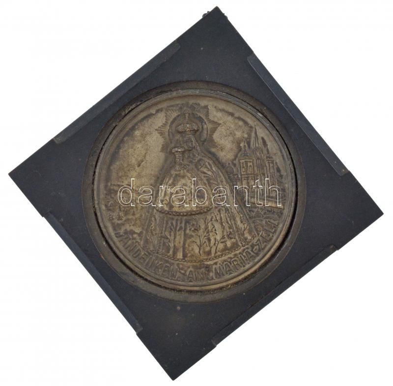 Description: Ausztria ~1900. "Mariazelli emlék" fém lemezplakett (59mm) fatáblán (89x80mm) T:2