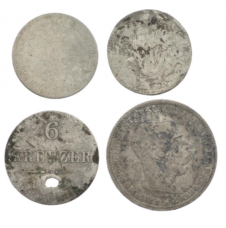 Austria 1849A 6 Kreuzer Ag (holed) + 1870. 10 Kreuzer Ag "Franz Joseph" (2x) + 1893. 1 Corona Ag "Franz Joseph" C:F,VG