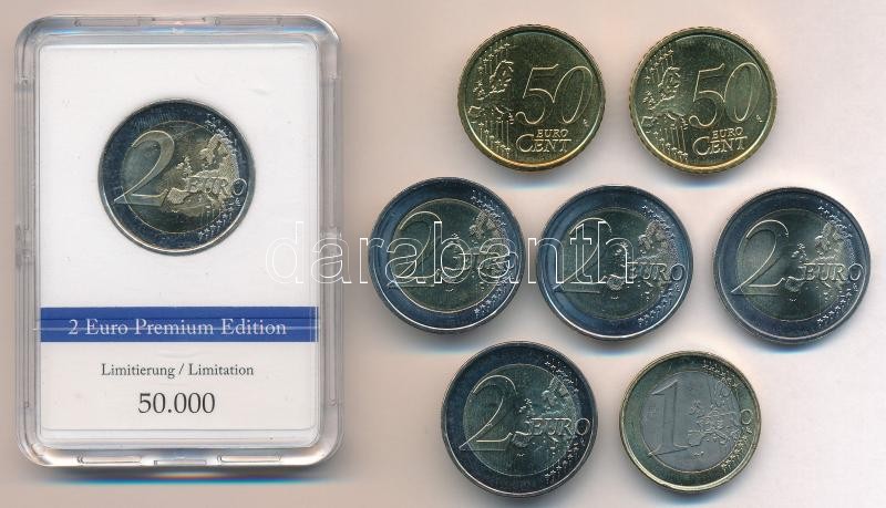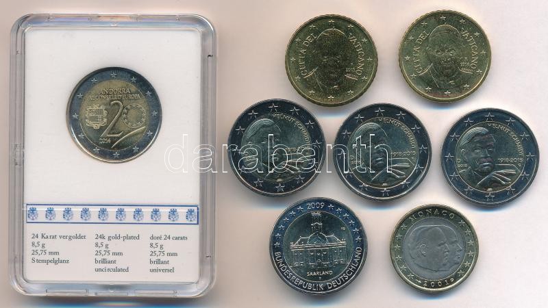 Vegyes: Andorra 2014. 2E "20 éve az Európa Tanácsban" aranyozott, tokban + Monaco 2001. 1E "III. Rainier" + Németország 2009F 2E "Saarland" + 2018D 2E "Helmut Schmidt" (3db) + Vatikán 2014-2015. 50c "Ferenc pápa" (2xklf) T:1-2