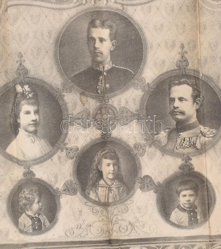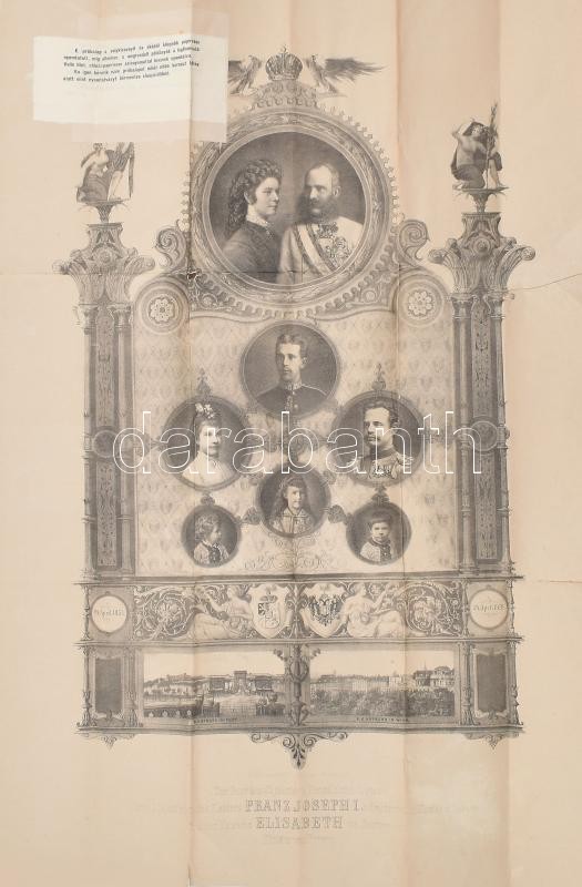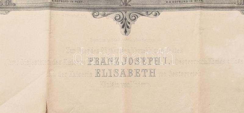 Description: 1879 Ferenc József és Erzsébet királyné 25. házassági évfordulója alkalmából készült és a királyi család tagjai mellett Budapest és Bécs látképét bemutató nagy méretű nyomat. Színes kőnyomatú kép mintalapja. címkével, hajtva, kis szakadással az egyik hajtásnál. 50x75 cm