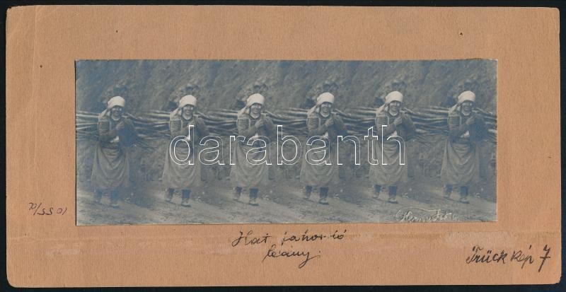 cca 1920 Kerny István (1879-1963) budapesti fotóművész hagyatékából hideg pecséttel jelzett, vintage ,,trück" fotó, azaz a nagyítás során készített fotómontázs (rőzsehordó), ezüst zselatinos fotópapíron, 5,4x13,8 cm, karton 9x18 cm
