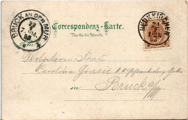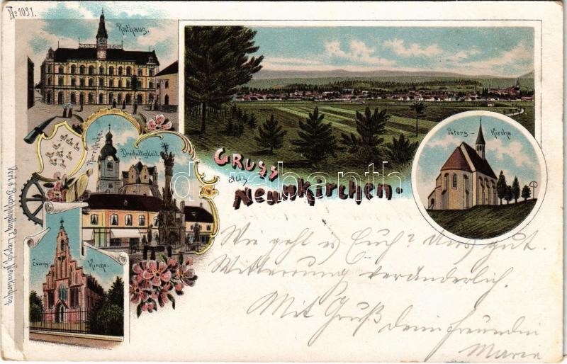 1898 (Vorläufer) Neunkirchen, Rathaus, Peters-Kirche, Pfarrkirche, Dreifaltigkeit, Evang. Kirche. Art Nouveau, floral, litho (EK)